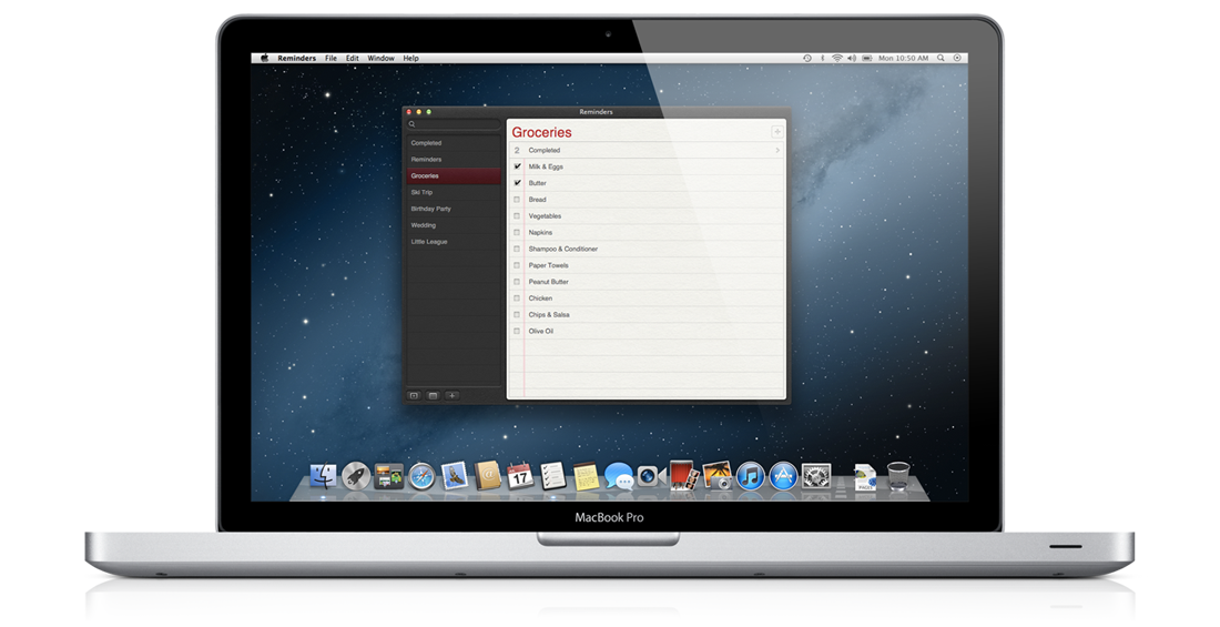 More than 100 million users have iCloud accounts, and Mountain Lion makes it easier than ever to set up iCloud and access documents across your devices. Mountain Lion uses your Apple ID to automatically set up Contacts, Mail, Calendar, Messages, FaceTime and Find My Mac. The new iCloud Documents pushes any changes to all your devices so documents are always up to date, and a new API helps developers make document-based apps work with iCloud.